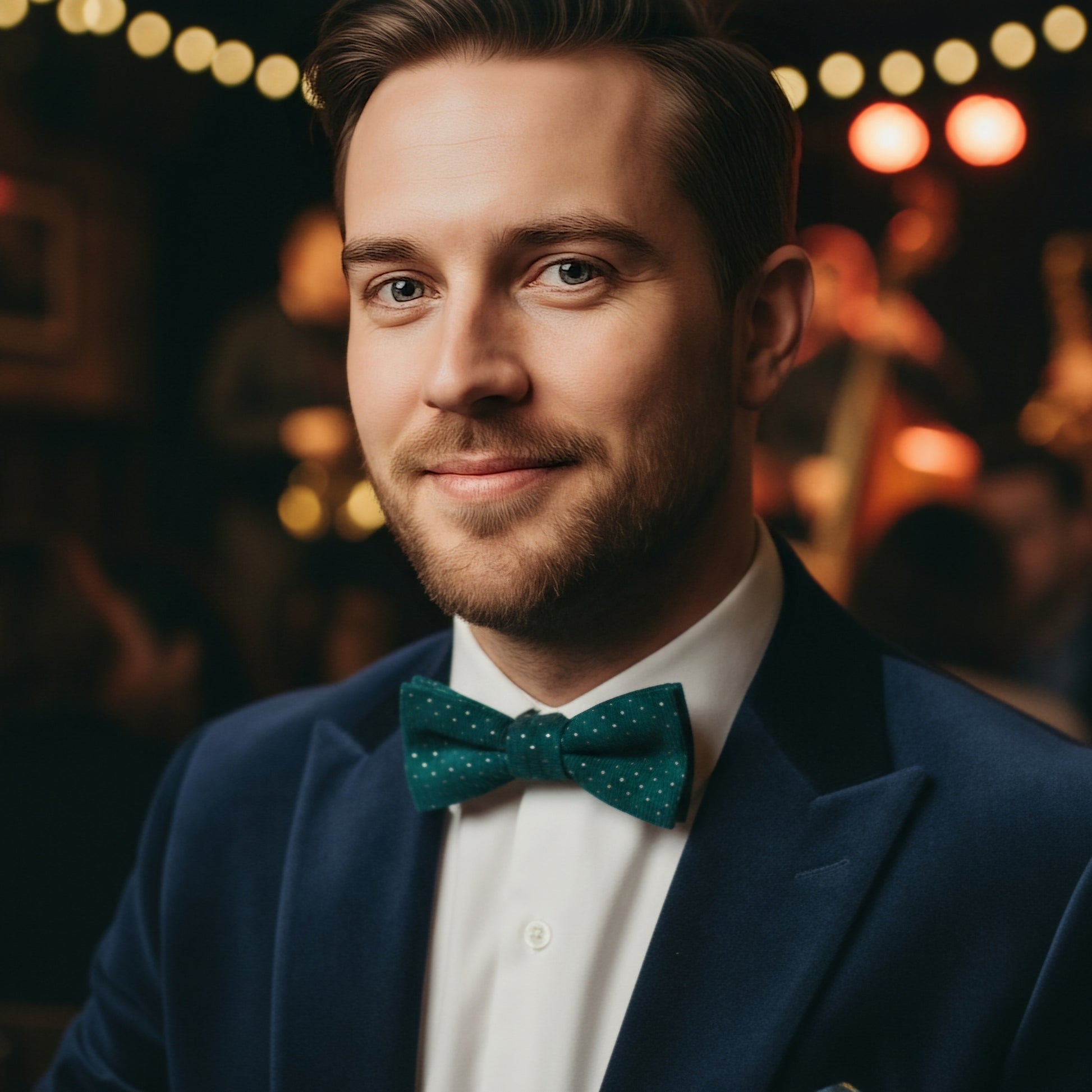 "Jusqu'aux étoiles" est un noeud papillon en velours vert avec de petits pois dorés. Il est très chic et résolument dandy. Sa coupe est droite.