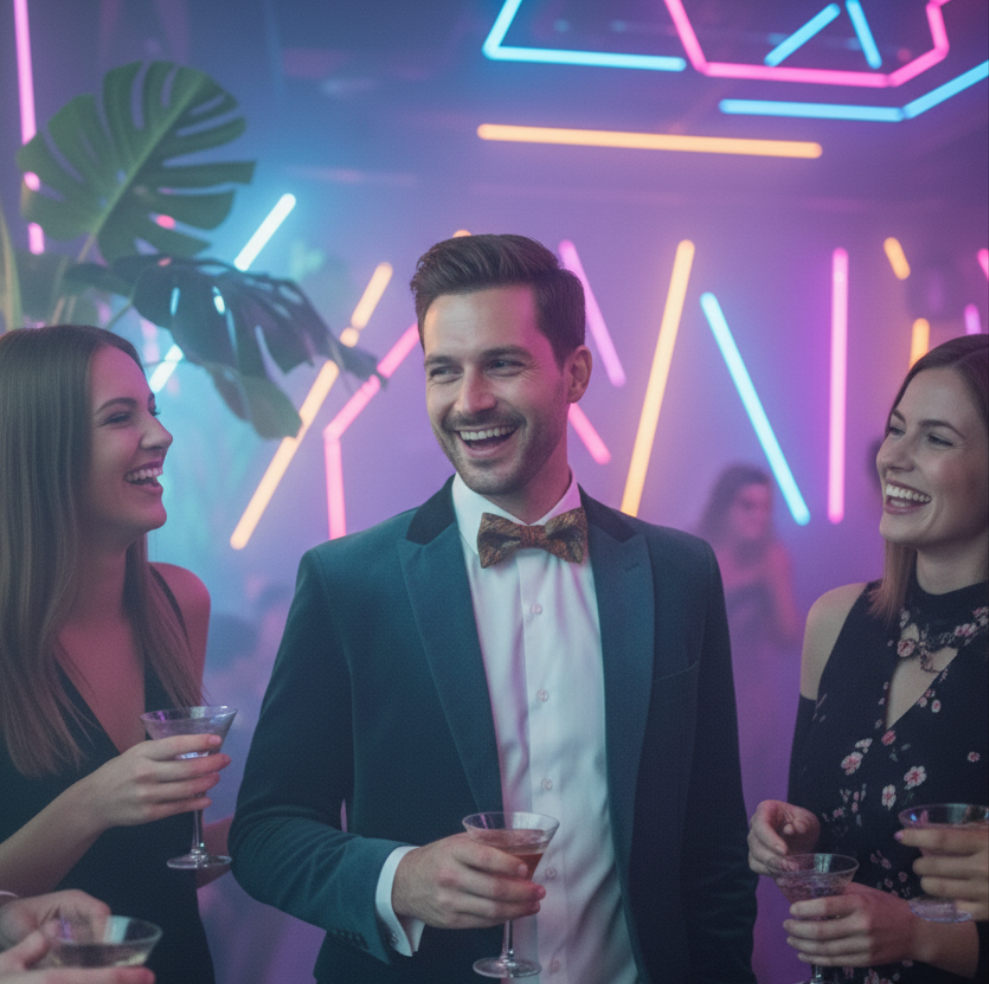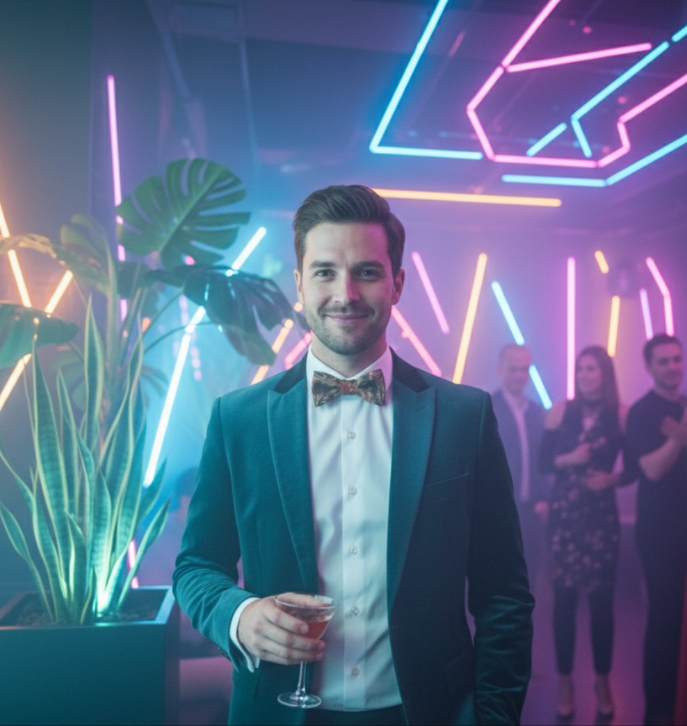 Un magnifique noeud papillon en liège avec un imprimé végétal jungle dans les teintes vertes, rouges et oranges. De petites inclusions dorées viennent surmonter le tout.